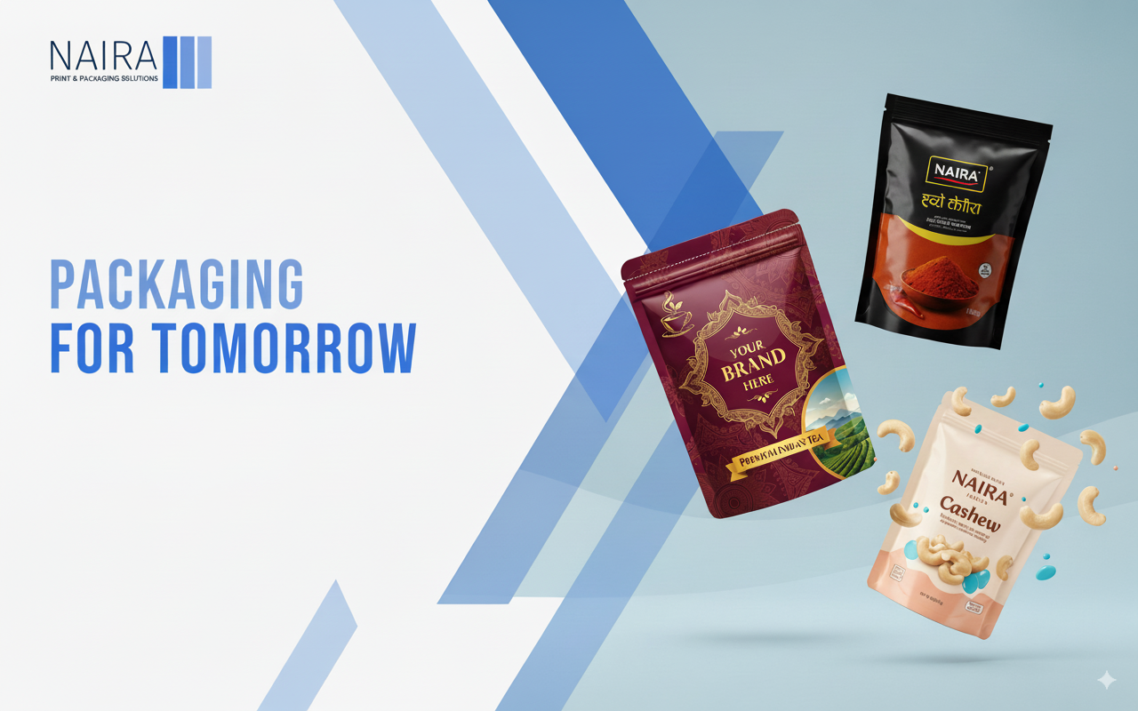 Custom Digital Printed Pouches: Options include pillow, stand-up, zipper, window, gusset, and three-side sealed pouches made from PET, LDPE, PP, or PVC—available in all sizes, with glossy or matte finishes and custom closures.